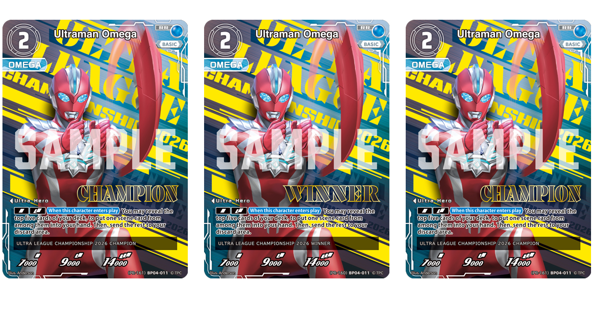 The PR card you will receive as a participation prize features designs from the popular ongoing series, Ultraman Omega! It depicts Ultraman Omega in a heroic pose, unleashing the Omega Slugger. The winner will receive a special design version with CHAMPION foiled onto it, while top finishers will receive one with a WINNER foil.