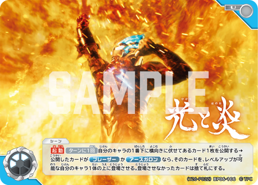 「挑戰賽」的優勝/隨機獎將是「光と炎 (光與炎)」。此卡收錄了「超人力霸王布雷薩」身披法多蘭護甲從烈焰中登場的經典場景。.