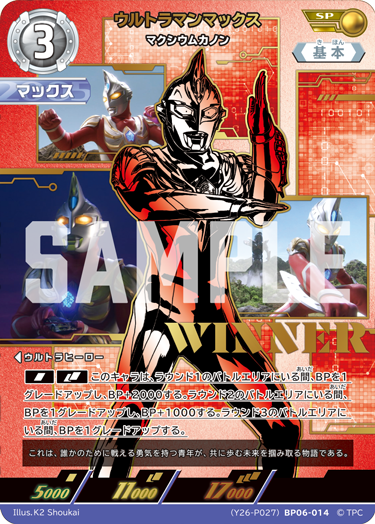 冠軍獎為「ウルトラマンマックス マクシウムカノン (超人力霸王馬克斯 馬克修姆加農炮)」,並加上了華麗的 WINNER 金色浮雕! 除了精美華麗的設計外,也請務必留意卡片上的背景敘述「超人力霸王馬克斯」的經典故事內容。