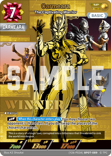 Hadiah untuk pemenang adalah “Carmeara The Captivating Warrior” dengan cap emas WINNER yang mewah. Bersama dengan desainnya yang mewah, pastikan untuk memperhatikan juga teks flavor yang menggambarkan kisah Carmeara.