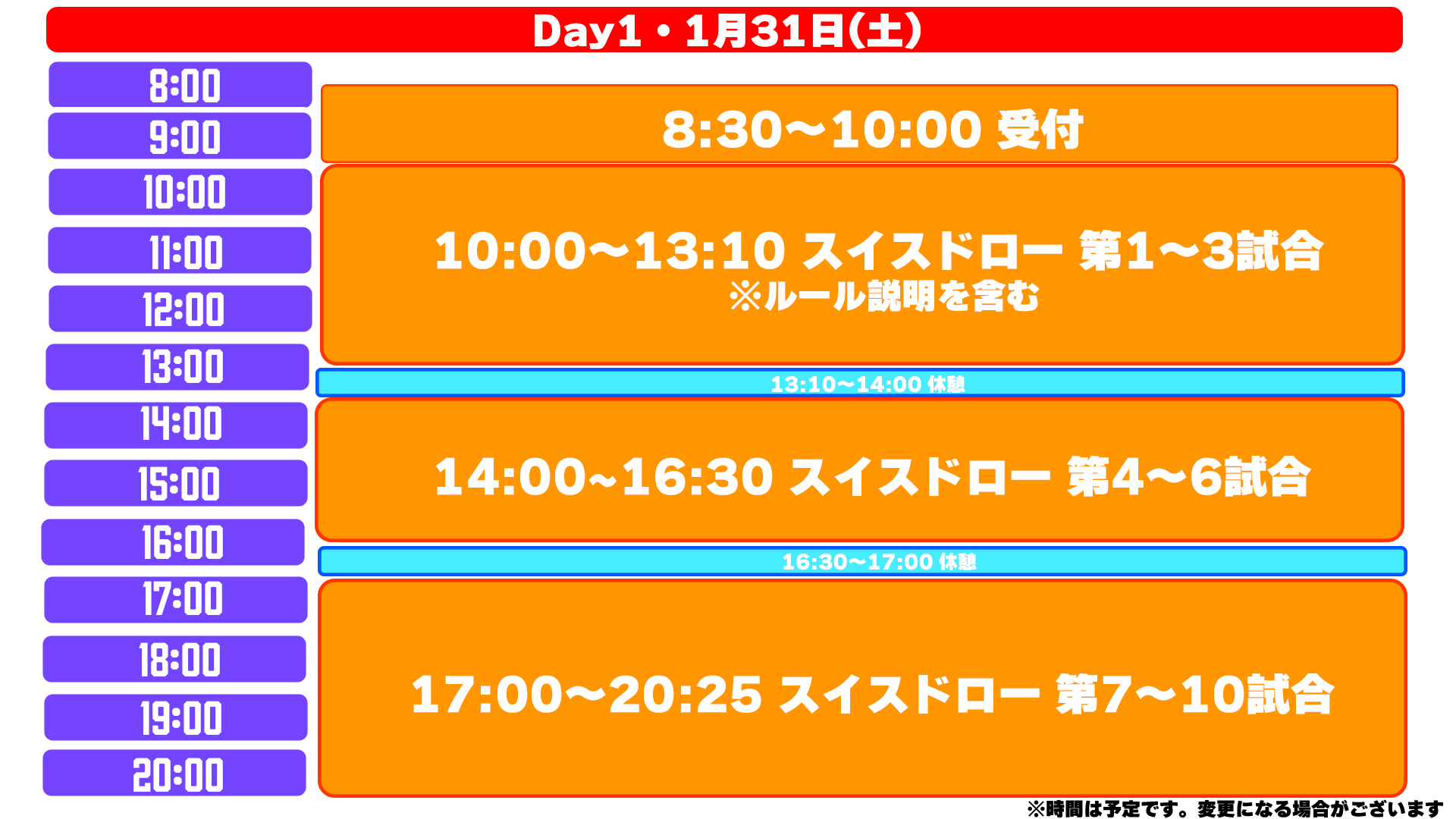 10:00~13:10 スイスドロー 第1~3試合 ※ルール説明を含む