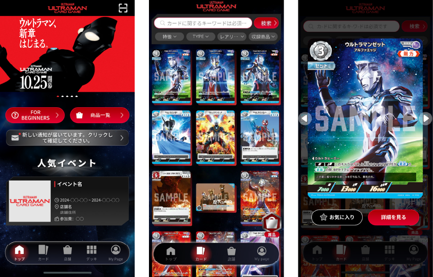 「ULTRA LEAGUE(ウルトラリーグ)」は「ウルトラマン カードゲーム」のプレイヤーをサポートするアプリで、10月9日(水)に世界同時リリースを予定しています。今後開催する「公認大会」、「公式大会」と連動し、「ウルトラマン カードゲーム」をプレイすることがより楽しくなるアプリです。