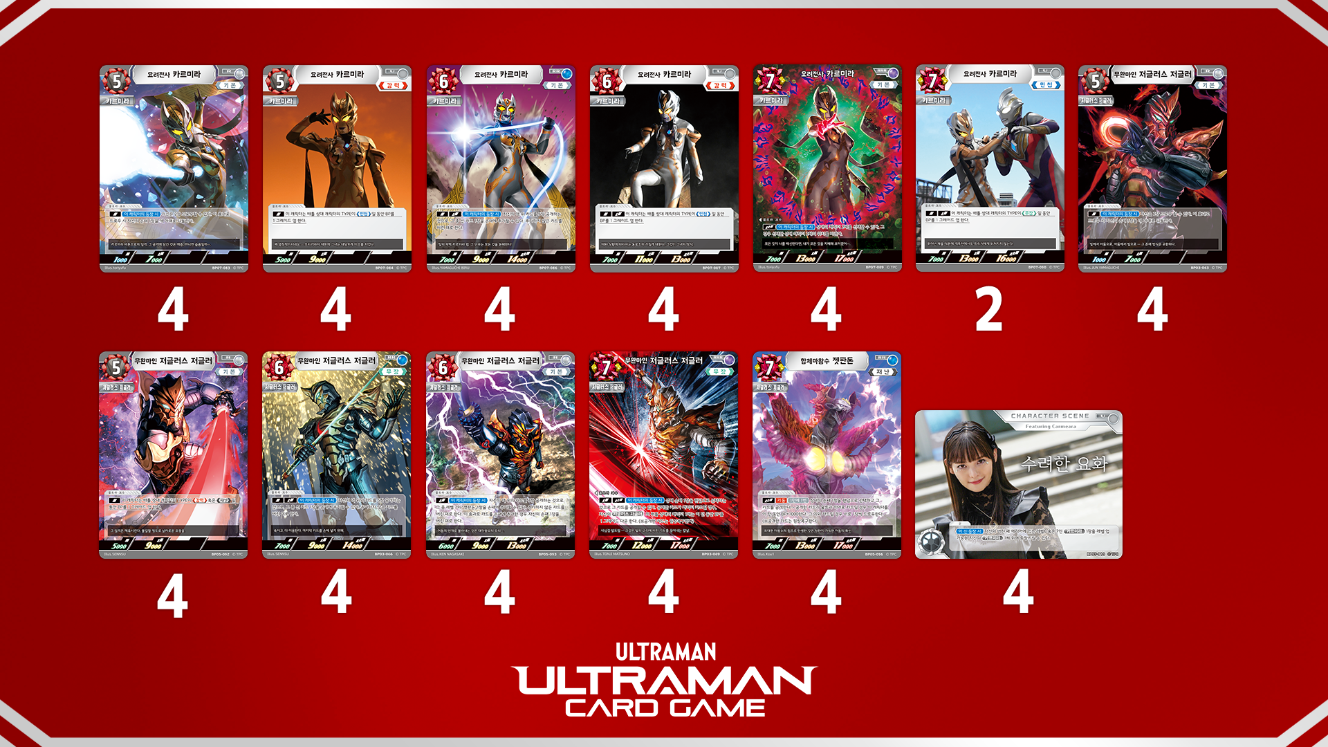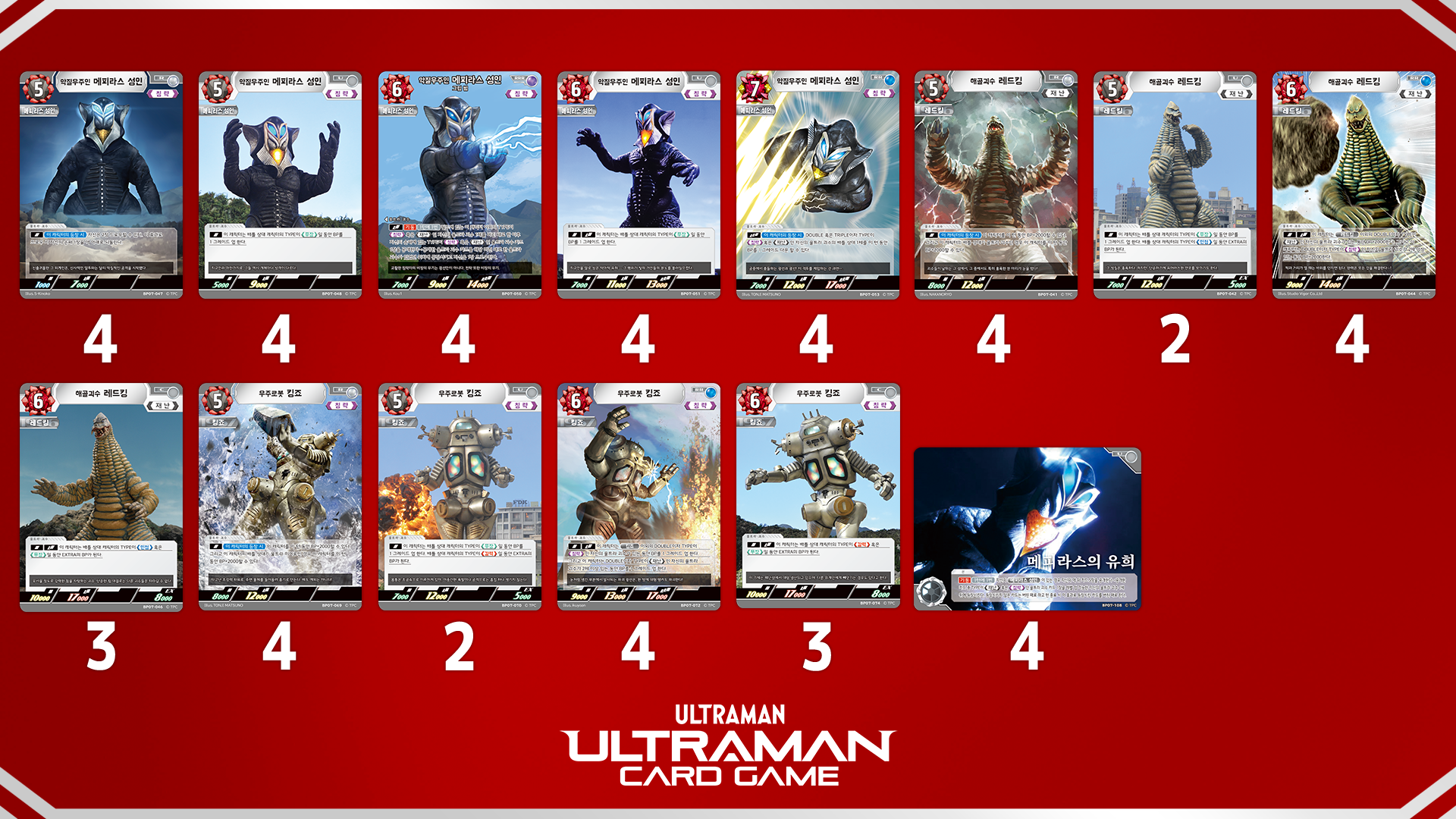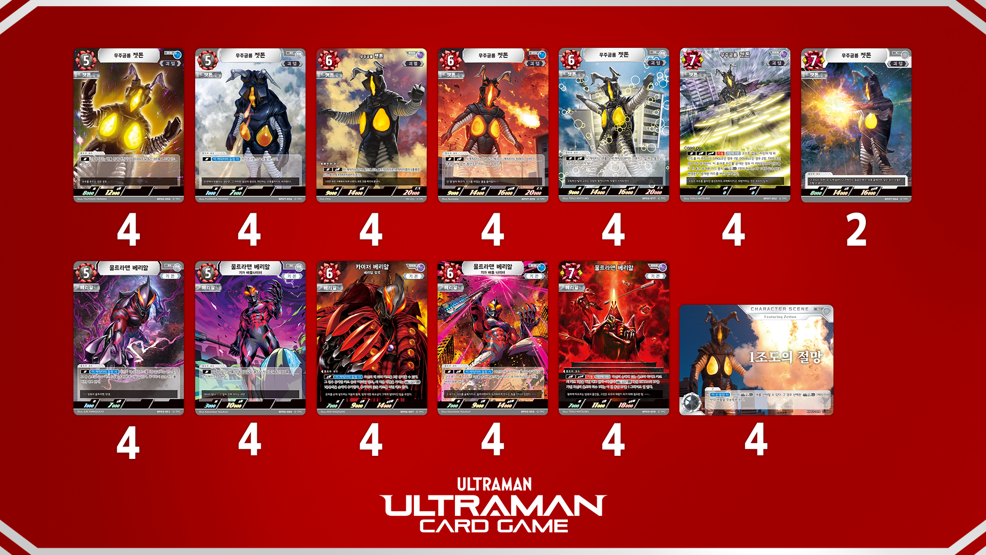 샘플 덱 리스트는 EXTRA가 BP 20000이 되는 카드를 최대한 투입하고, EXTRA의 BP를 가진 괴수와 궁합이 좋은 울트라맨 베리알을 조합한 압도적인 강적 콤비를 소개드립니다. 덱을 꼭 만들어보세요.