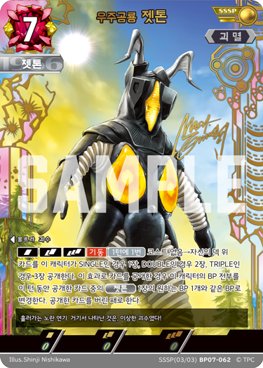 일러스트는 “과거 울트라맨을 쓰러뜨리고, 몇번이고 앞을 가로막아 온 강적”으로서의 젯톤에 초점을 맞추었습니다 (AP(12/20) BP07-056 등). 카드를 손에 넣은 여러분께서, 압도적인 "강적"임을 느끼실 수 있는 아트워크가 되었기를 바랍니다.