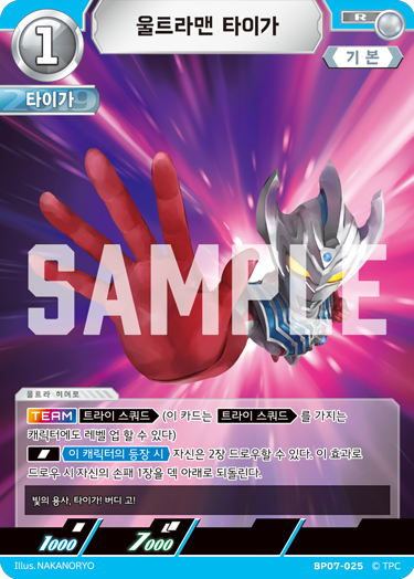 「울트라맨 타이가」카드에는 <TEAM>이라는 여러 히어로들로 덱을 구성하면 효과를 발동할 수 있는 이번 탄부터 시작한 새로운 효과가 있습니다.