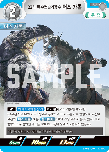수정: [SIN][DBL]《이 캐릭터의 등장 시》[차지 ①]【어스 가론/블레이자】 (※자신의 덱 위의 카드 1장까지 공개하고 그 카드를 가로 방향이자 뒷면으로 하고 자신의 『어스 가론』 혹은 『블레이자』 1체의 가장 아래로 둘 수 있다. 가로 방향이자 뒷면으로 한 카드는 DOUBLE 등의 상태로 포함되지 않는다)