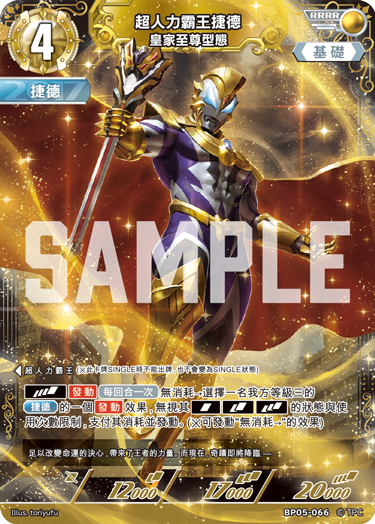 此外,“超人力霸王捷德皇家至尊型態 (RRRR)” (BP05-066) 能重複使用崇高型態的效果,或是在銀河躍昇發動登場效果後再進行升級,使其 BP 高達 17,000!可能性可謂無窮無盡。