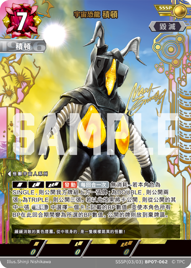 BP07「大怪獸超進擊」已正式發售。本彈作為第二彈「怪獸主題彈」,以宇宙恐龍積頓作為牌組核心概念,同時 美菲拉斯星人作為繼超人力霸王貝利亞之後,全新的怪獸牌組核心軸首次參戰。