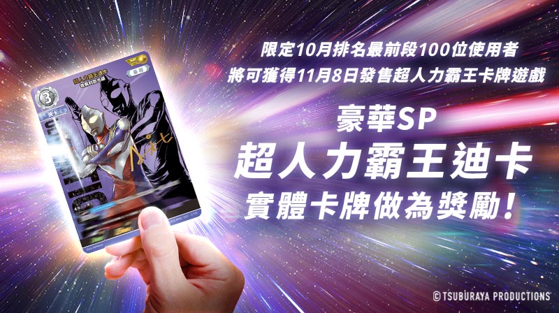 ・特典:向每月底排名前100名的用戶,贈送《超人力霸王卡牌遊戲》的實體卡牌。首回特典為「超人力霸王迪卡」的豪華版卡牌。