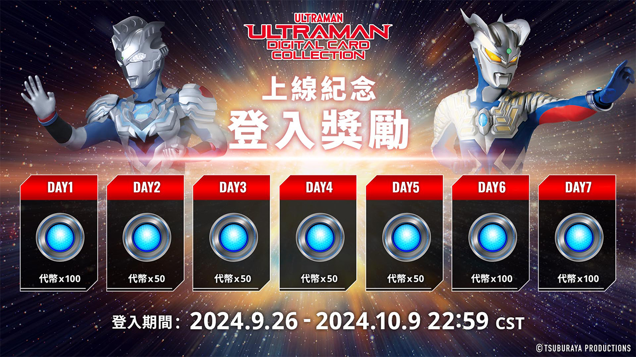 在活動期間內,登入應用程式《超人力霸王電子卡牌收藏》合計7天,即可獲得最多相當於30張電子卡牌分的應用程式內代幣,這是一個特別的登入獎勵活動。請登入應用程式來獲取電子卡牌。實施期間:2024年9月26日(四)~2024年10月9日(三)
