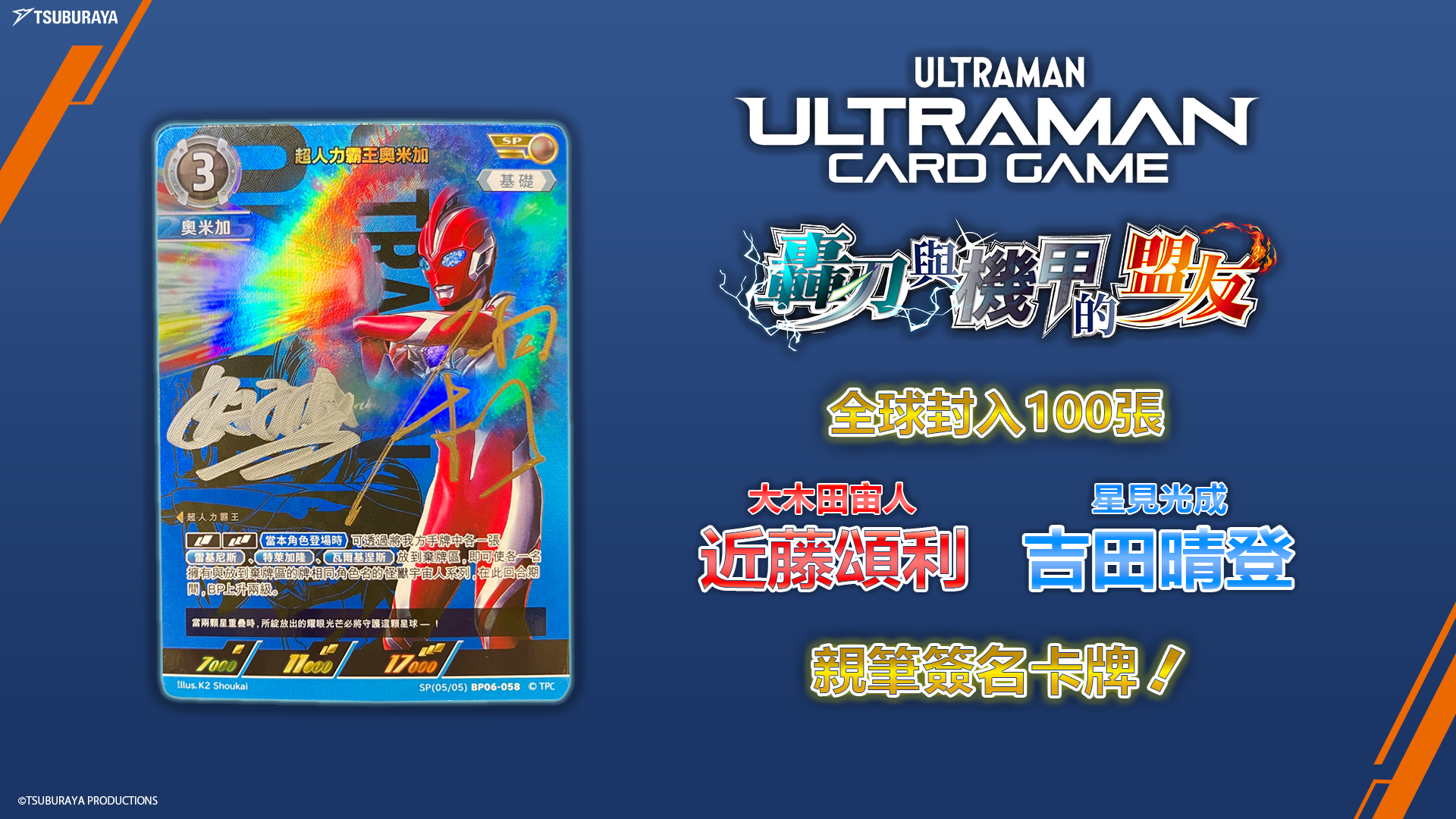 我們將推出特別活動,限量版 「超人力霸王奧米加(SP)」 卡牌,由在《超人力霸王奧米加》中飾演大木田宙人的近藤頌利與飾演星見光成的吉田晴登親筆簽名,並將隨機封入第6彈強化包「轟刃與機甲的盟友」(BP06)中。