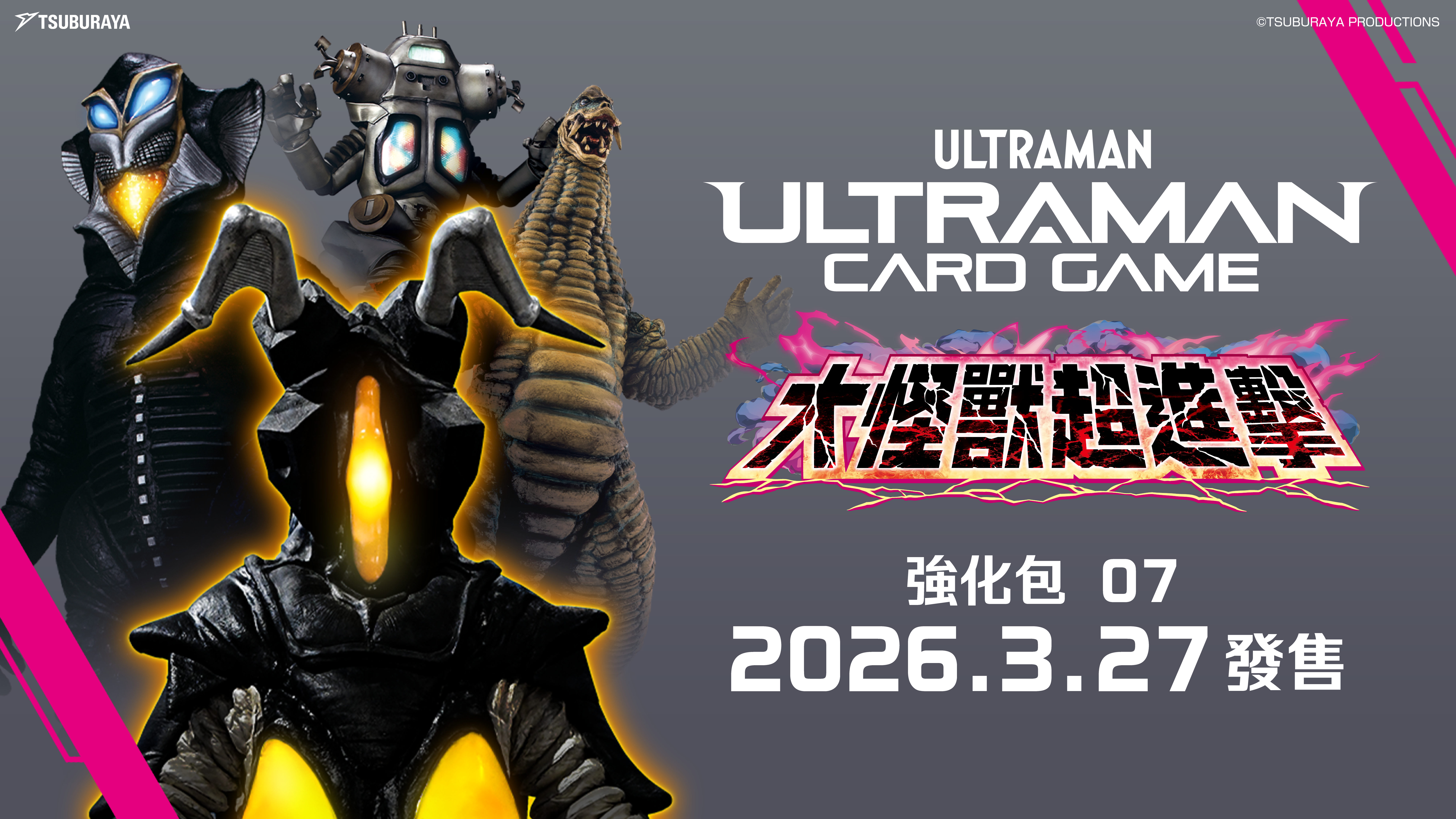 《超人力霸王卡牌遊戲》強化包第 07 彈 「大怪獸超進擊」,以及全新官方卡套與卡盒,將於 2026 年 3 月 27 日(星期五) 正式上市。
