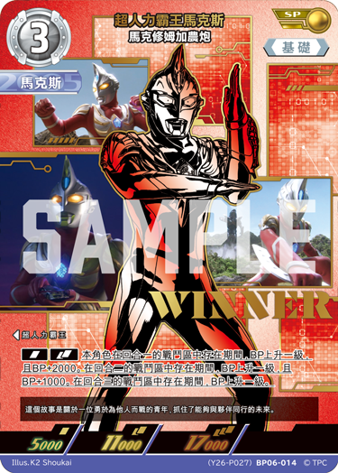 冠軍獎為「超人力霸王馬克斯 馬克修姆加農炮」,並加上了華麗的 WINNER 金色浮雕! 除了精美華麗的設計外,也請務必留意卡片上的背景敘述「超人力霸王馬克斯」的經典故事內容。