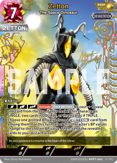And this time—amazingly—Shinji Nishikawa has illustrated the SSSP card. Experience that overwhelming despair of Zetton’s arrival through the card art.